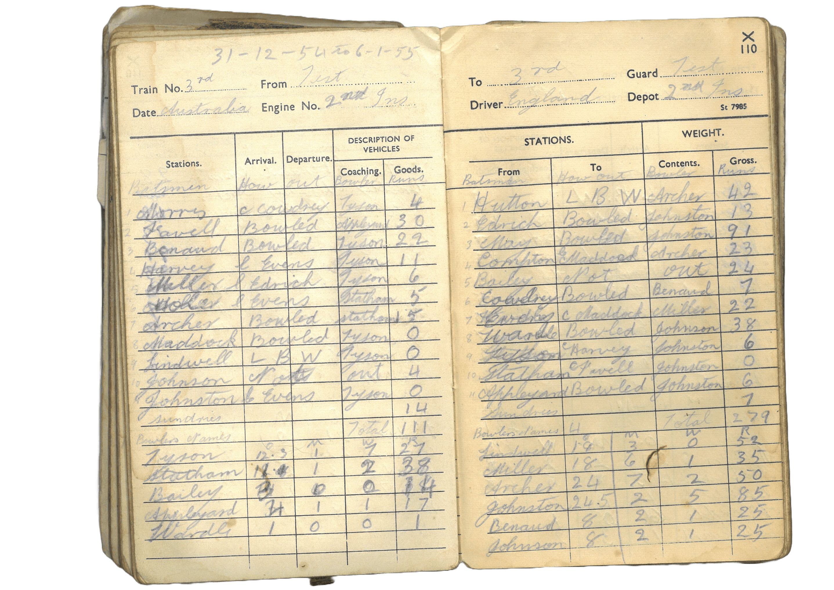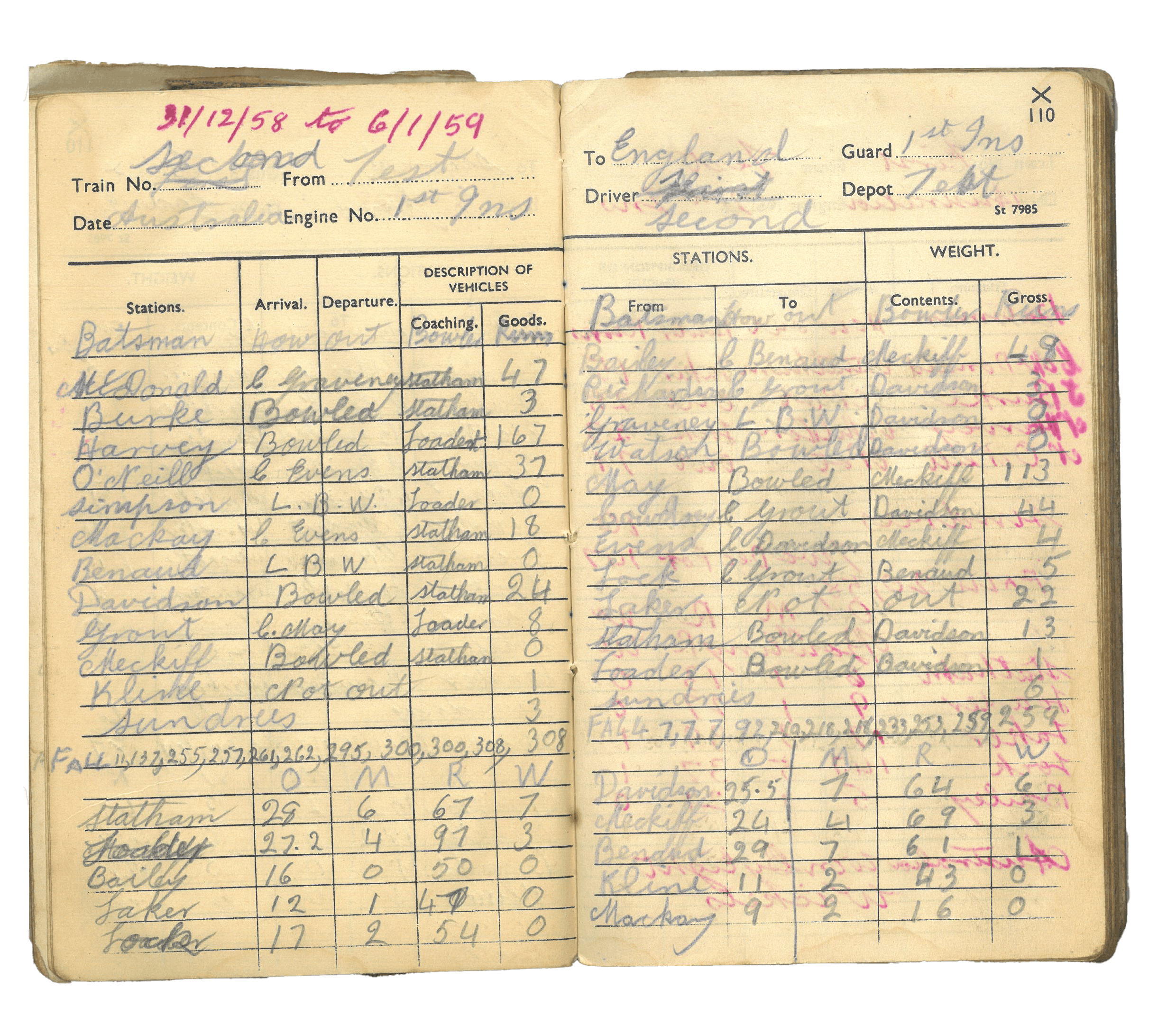 The early 1950s was the dawn of the transistor radio – is it plausible to think that by the time Grandfather was keeping the scorebook I now have in my possession, he might have carried a radio with him, to listen to the cricket as he worked? Nanna says no, that radios were still too heavy then to be easily portable, but she does think it’s likely he would have taken his scorebook to work with him for smoko, when chat would have turned to what was happening in the match. And then there were the public holidays – Boxing Day, New Year’s Day – which remain the prime dates for Test cricket in Australia even now. I look and find it: the New Year’s Test of 1954-55, with Frank Tyson’s seven wickets for 27 runs, duly recorded in Grandfather’s hand. Train No. 3rd Test. Engine No. 2nd Ins.