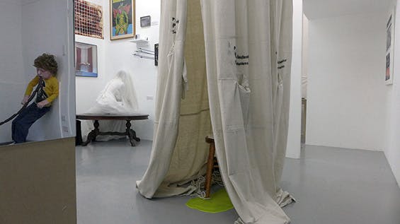 Gallery 1 Installation View (from left to right) Hany Armanious, Ronnie Van Hout, Quinto Sesto, Carla Cescon, Jesse Hogan. Courtesy the artists. From the exhibition A Kitten Drowning in a Well: Tribute Exhibition to Mike Kelley (1954-2012), at 55 Sydenham Rd until 14 December.