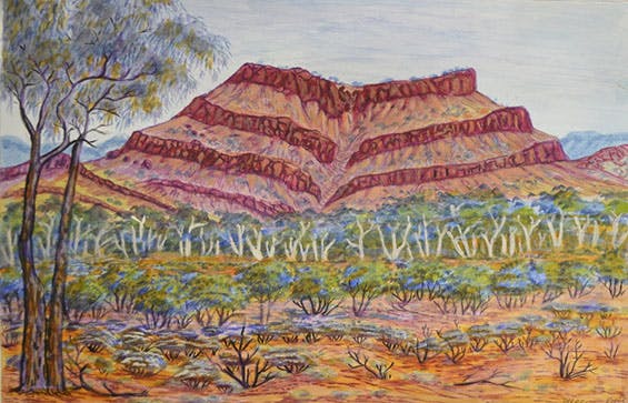 If you have travelled to Central Australia, you are sure to recognise the scene immediately. There is no missing the way the light plays off the landscape. The vivid oranges, reds and greens that eventually roll away, opening out to colours that seem already washed through with water – milky purples, smouldering pinks and dusky greys. For those who have seen them, the MacDonnell Ranges are difficult to forget. They stretch out to the east and west of Alice Springs like a long line of bunched up caterpillars. Leaving town, and travelling along the highway, whether towards Hermannsburg, where famed ranges painter Albert Namatjira lived, or east towards Trephina Gorge, it is impossible not to be startled into silence at the constancy of their beauty.