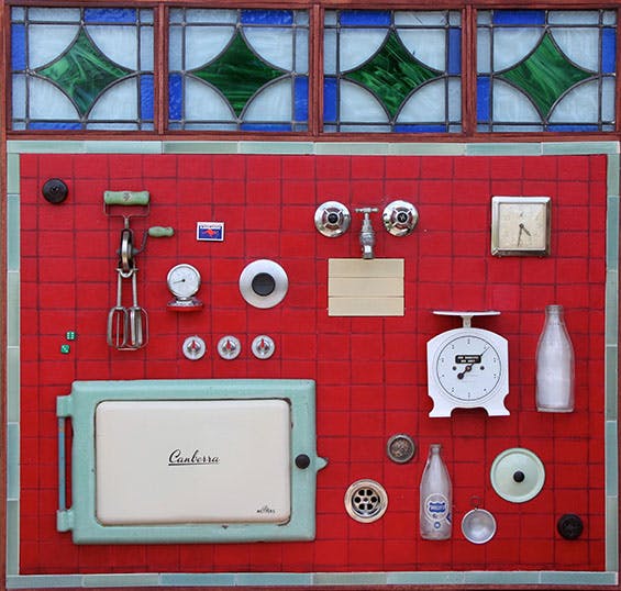 Susan O’Doherty, Earlwood Kitchen, mixed media assemblage, 120 x 130 x 20 cm, courtesy the artist and Spot81. Part of the exhibition Moving House at the Blue Mountains Cultural Centre until 24 August 2014.