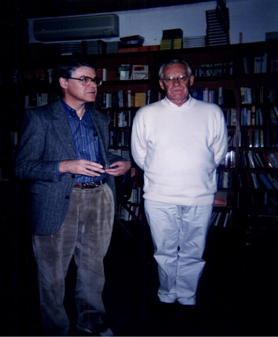 Alain Badiou and John Bacon at Gleebooks, 1999. Photo: Melissa McMahon. Reproduced with permission.
