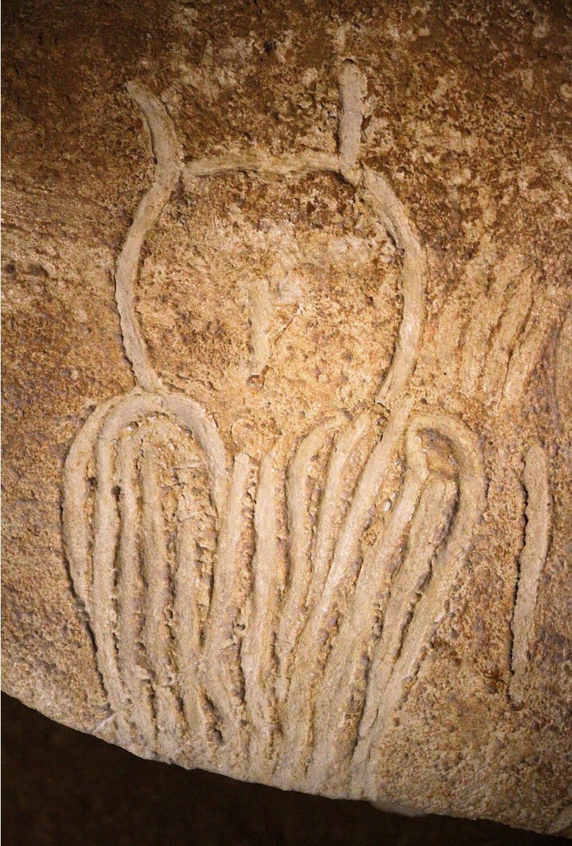 Owl, engraved by finger into the soft wall, Pont d’Arc cave (copy of the Chauvet Cave), 2016. Image: Claude Valette, reproduced under the Creative Commons Attribution-Share Alike 4.0 International license via Wikimedia Commons.